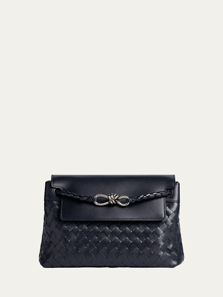 Bottega Veneta small "Andiamo" messenger bag crafted from distinctive intrecciato leather with signature knot hardware Adjustable and detachable crossbody strap Flap top Interior, one zip pocket Canvas lining Approx. 7.9"H x 11.4"W x 5.11"D Made in Italy Online Inquiries: BGS21_NDRGP| Store Inquiries: #5072459