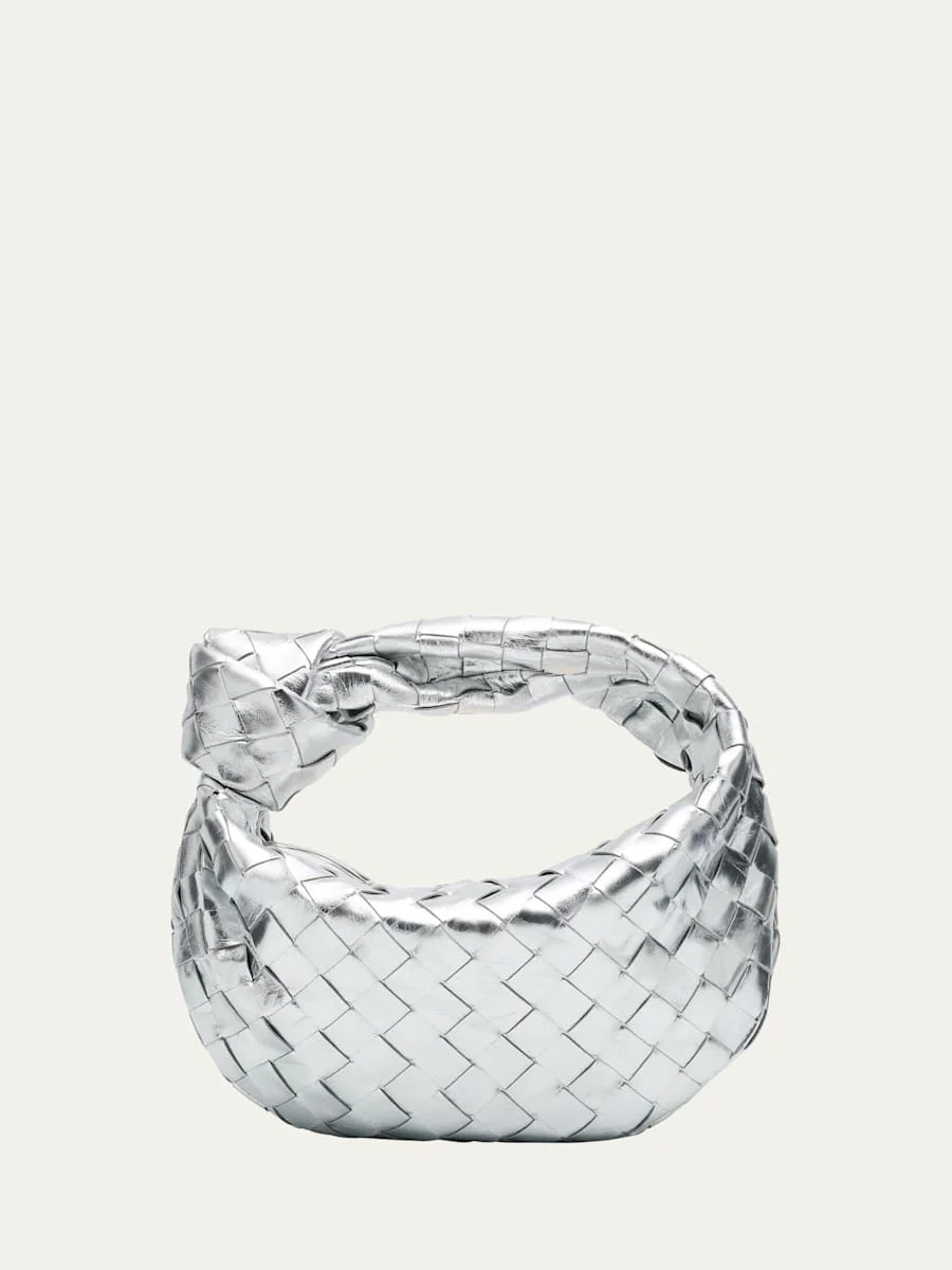 Bottega Veneta "Jodie" top handle bag in intrecciato metallic leather Knot top handle Zip top closure Lining: Leather Approx. 5.1"H x 10.2"W x 3.3"D Made in Italy