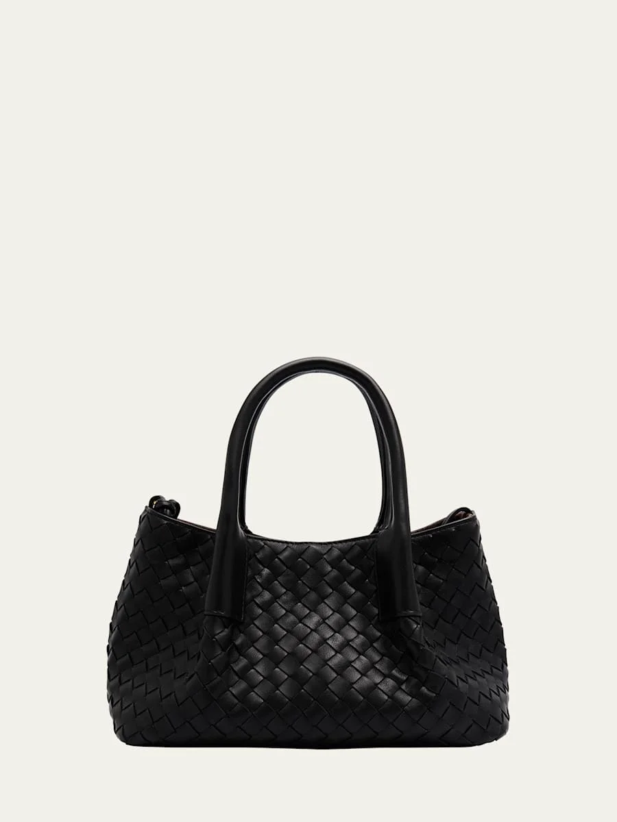 Bottega Veneta tote bag in intrecciato silky calf leather Rolled top handles Detachable, adjustable shoulder strap Can be worn as a top handle or shoulder bag Open top with self-tie closure Interior, leashed zip pouch bag Approx. 5.9"H x 9.4"W x 4.7"D Made in Italy Online Inquiries: BGS21_V6DZJ| Store Inquiries: #4928564