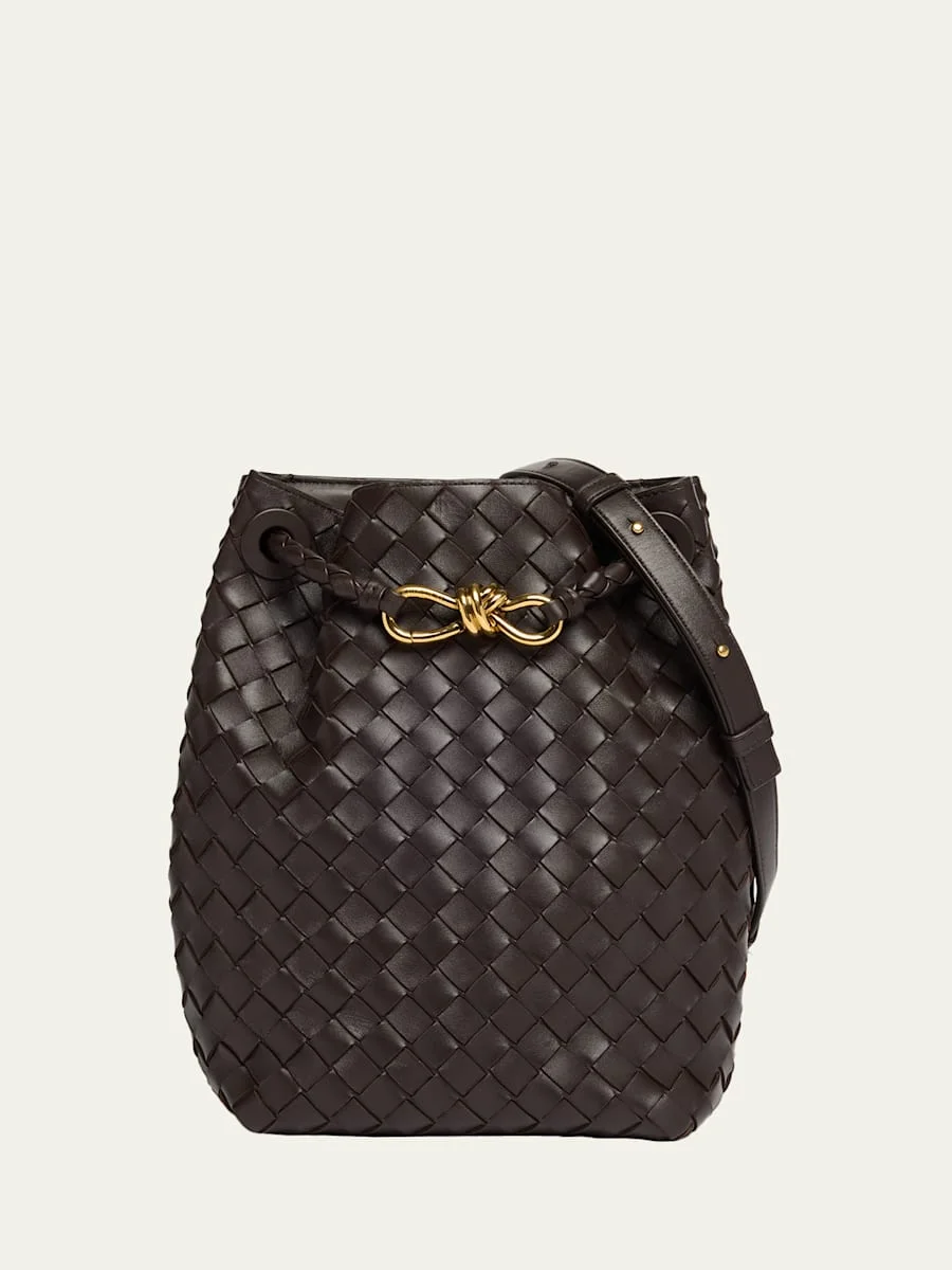 This Bottega Veneta crossbody bucket bag is crafted in supple intrecciato leather, finished with the signature knot accent in goldtone metal Sliding shoulder strap, 9.8" drop Detachable, adjustable crossbody strap, 17.7" drop Can be worn as a shoulder or crossbody bag Open top Divided interior, one zip pocket Lining: Leather Approx. 11.8"H x 7.3"W x 4.3"D Made in Italy