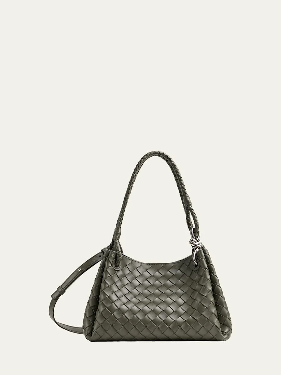 Bottega Veneta "Parachute" medium shoulder bag in intrecciato nappa leather, complete with goldtone hardware Shoulder straps, 8.7" drop Detachable, adjustable crossbody strap Can be worn as a shoulder or crossbody bag Open top with magnetic closure Interior, attached zip pouch Approx. 7.3"H x 11.6"W x 6.9"D Made in Italy