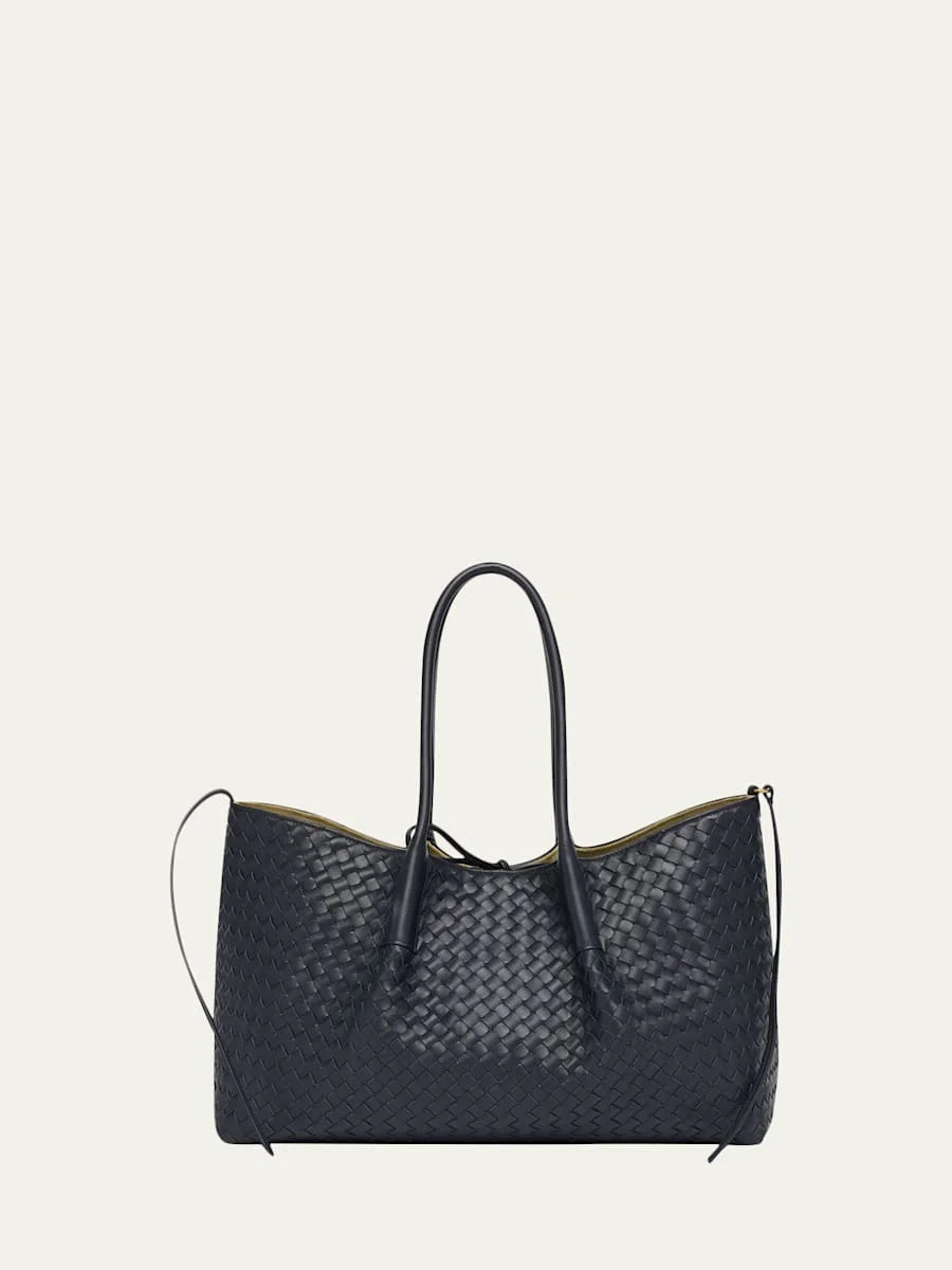 Bottega Veneta "Pinacoteca" reversible tote bag in intrecciato leather and suede Shoulder straps Open top with selftie closure Interior, removable zip pouch Suede lining Approx. 6.9"H x 16.9"W x 9.1"D Made in Italy