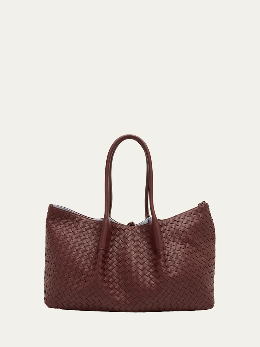 Bottega Veneta reversible tote bag in intrecciato leather and suede Shoulder straps Open top with self-tie closure Interior, removable zip pouch Suede lining Approx. 6.9"H x 16.9"W x 9.1"D Made in Italy Online Inquiries: BGS21_V6DZZ| Store Inquiries: #4928579