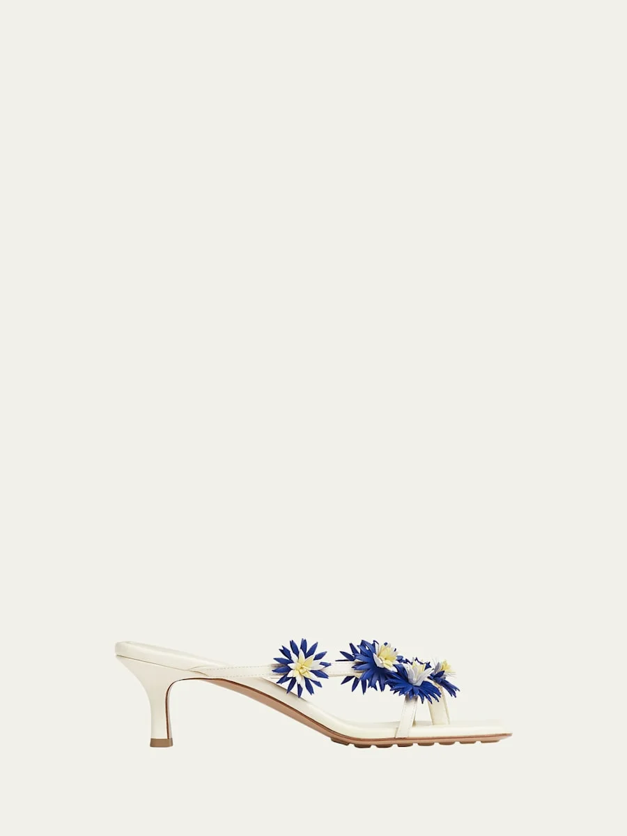 Bottega Veneta "Riva" mule sandals are crafted from smooth lambskin leather with multicolored leather floral appliques 2.00 in / 50 mm kitten heel Square open toe Thong stra Slipon style Leather lining Rubber outsole Made in Italy