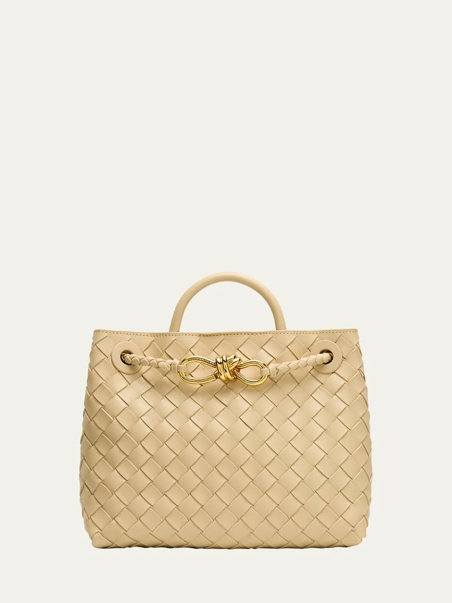 Bottega Veneta "Andiamo" tote bag in intrecciato leather Top handle, 2.4" drop Adjustable crossbody strap Can be worn as a top handle or crossbody bag Open top with magnetic closure; center knot accent Interior, one zip pocket and one slip pocket Approx. 7.9"H x 9.6"W x 3.9"D Made in Italy Online Inquiries: BGS21_V60XD| Store Inquiries: #4638079