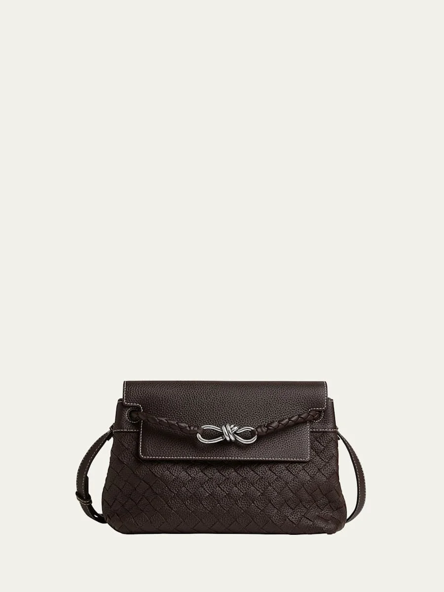 Bottega Veneta "Andiamo" messenger bag in intrecciato grained leather with contrasted stitching Features signature silver-tone knot detail Adjustable, detachable crossbody strap; 22.8" drop Interior, one slip and one zip pocket Flap closure with snap Polyester/canvas lining Approx. 11.4"W x 7.9"H x 5.1"D Wipe clean Made in Italy Online Inquiries: BGS21_NDEPL| Store Inquiries: #5031040