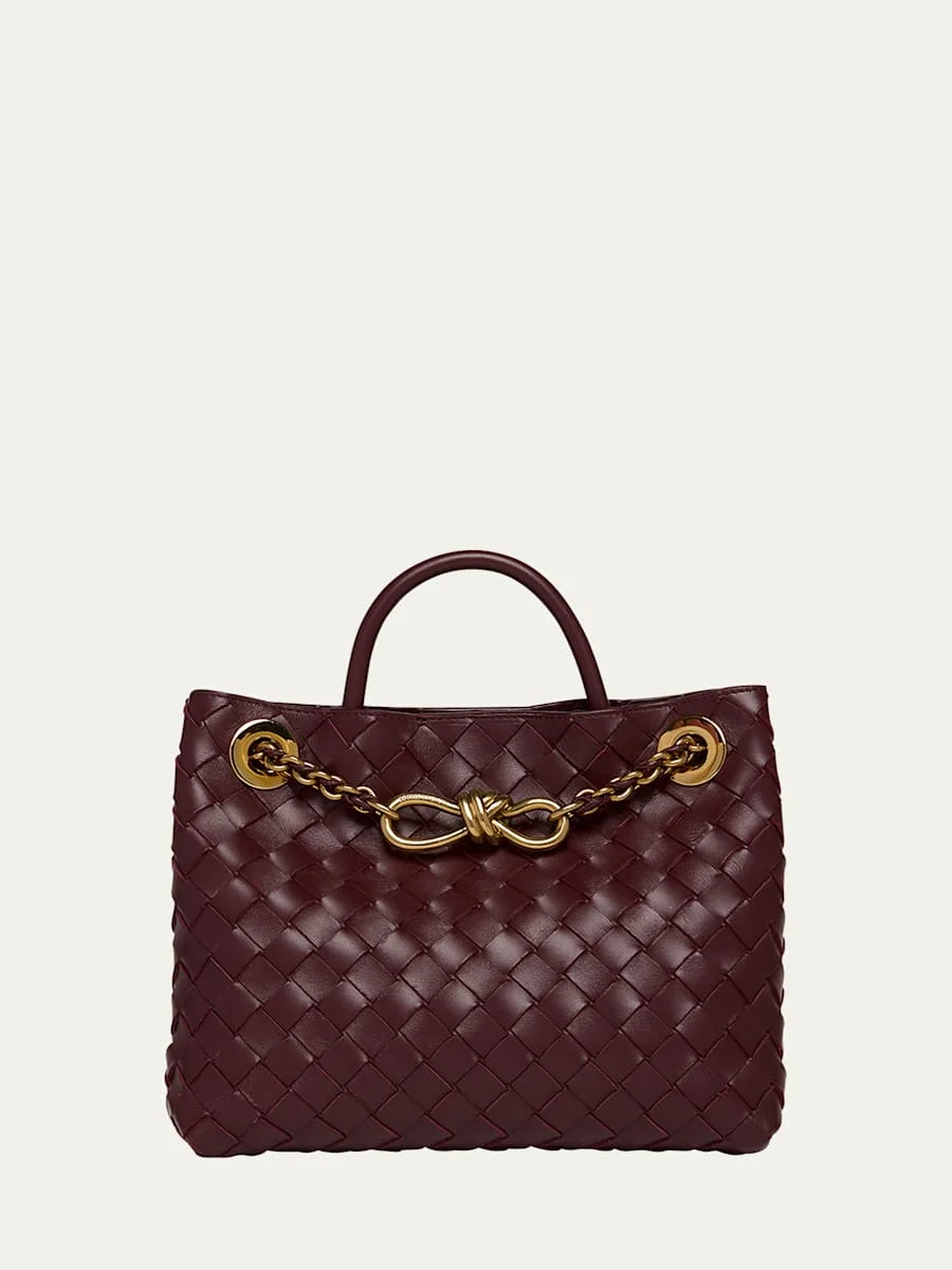 Bottega Veneta "Andiamo" shoulder bag in intrecciato leather Top handle Sliding woven chain shoulder strap Can be worn as a top handle or shoulder bag Open top with knot sliding chain closure Interior, one zip pocket and one slip pocket Approx. 8"H x 10"W x 4"D Made in Italy Online Inquiries: BGS21_V666A| Store Inquiries: #4746089