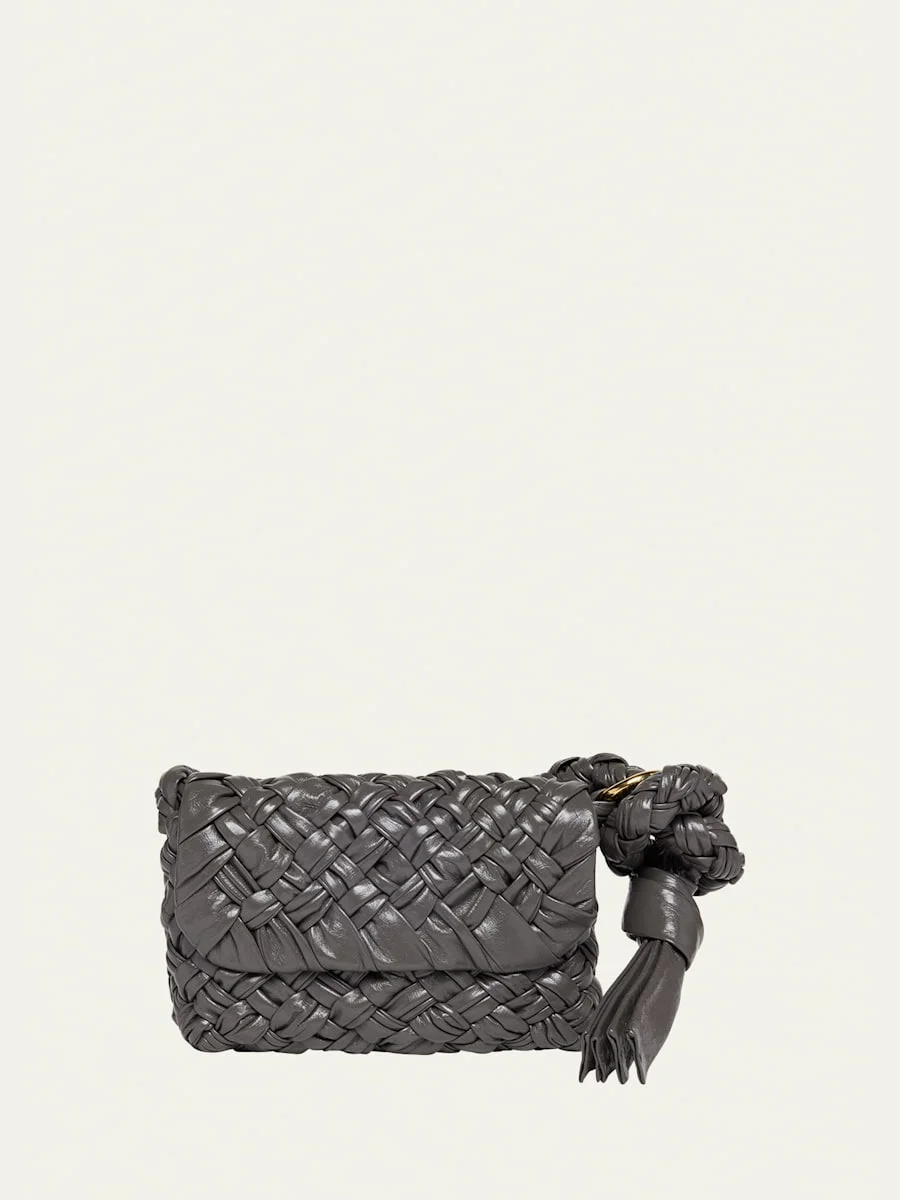 Bottega Veneta "Kalimero" shoulder bag in padded knot intrecciato leather Adjustable shoulder straps Flap top Interior, one zip pocket Approx. 6.3"H x 9.8"W x 2"D Made in Italy