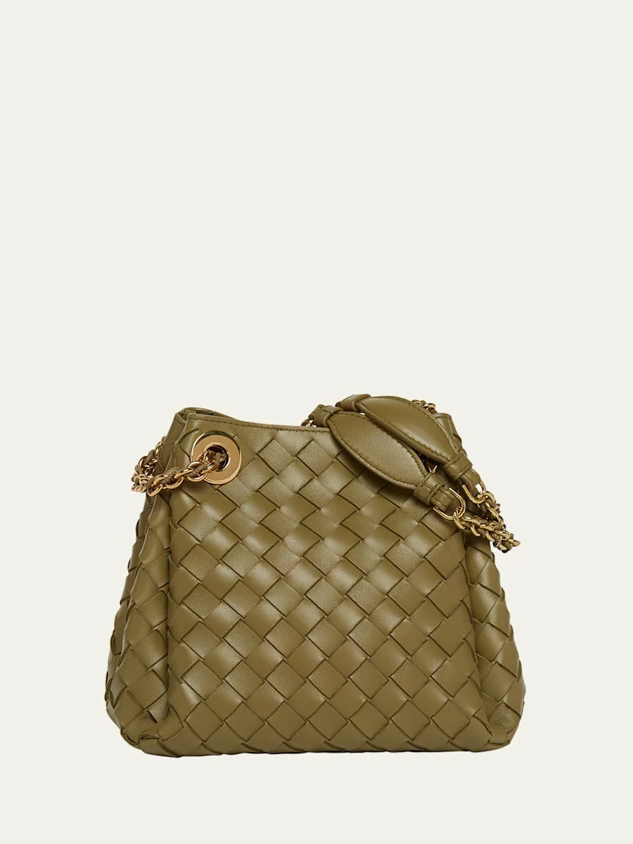 Bottega Veneta "Parachute" shoulder bag in intrecciato leather Sliding chain/leather shoulder strap Can be worn as a shoulder or crossbody bag Open top with magnetic closure Approx. 6.5"H x 7.9"W x 6.7"D Made in Italy