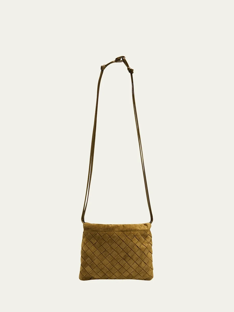 Bottega Veneta pouch bag in soft intrecciato suede Shoulder straps with snap button, 21.6" drop Drawstring closure Lining: Nylon Approx. 6.5"H x 8.3"W x 0.4"D Made in Italy