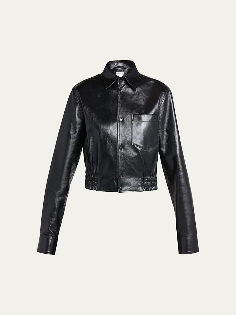 Bottega Veneta short jacket in smooth Nappa leather Spread collar Button front Long sleeves; blouson style Front patch pocket Hip length; elastic waist Relaxed fit Lambskin leather Made in Italy Model is 5'10"/177cm. Online Inquiries: BGS21_B8L9E| Store Inquiries: #4592597