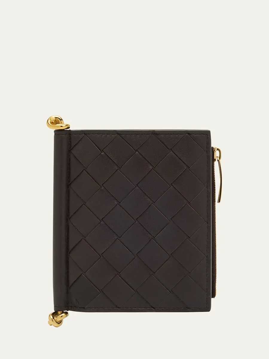 Bottega Veneta "Solstice" bifold wallet in intrecciato leather with knot hardware accent Flap top with snap closure Interior, six card slots, two slip pockets, one zip pocket Lining: Leather Approx. 4.5"H x 3.9"W Made in Italy