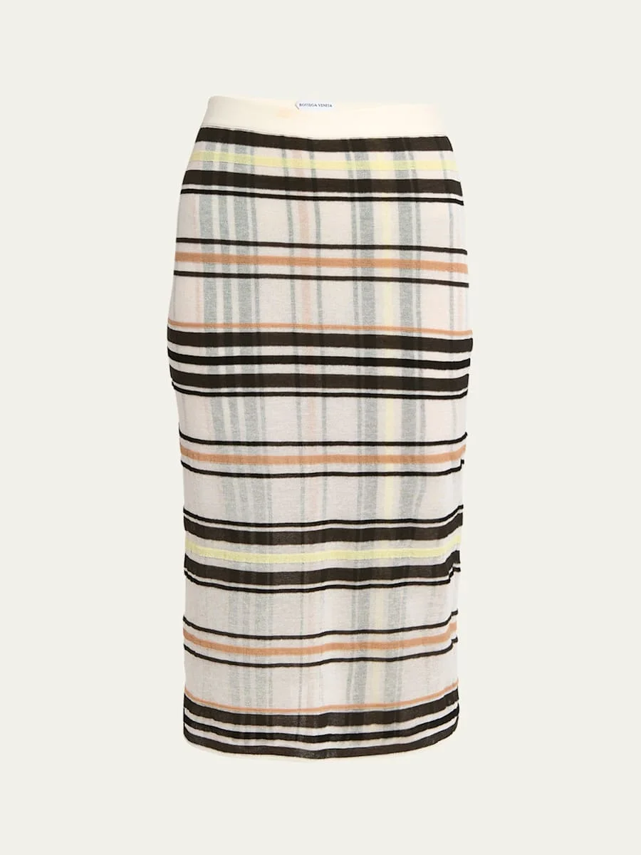 Bottega Veneta knit skirt in stripe check motif Banded waist Midi length Body-conscious silhouette Pull-on style Cotton/nylon/polyamide/elastane Made in Italy Model is 5'10"/177cm. Online Inquiries: BGS21_B9AFL| Store Inquiries: #4822932