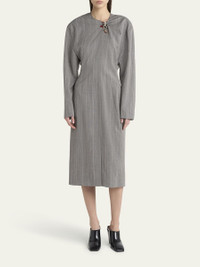 Bottega Veneta dress in subtle stripe melange wool with a metal frog brooch Round neckline Long sleeves; button cuffs Hem falls below the knee Sheath silhouette Back center slit Invisible zip closure Wool/cotton/viscose Made in Italy Online Inquiries: BGS21_B9W3W| Store Inquiries: #4985813