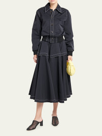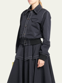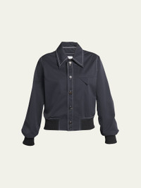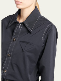 Bottega Veneta tech nylon bomber shirt featuring signature flap chest pocket, contrast topstitching, and banded cuffs and hem Point collar; button front Long sleeves; button cuffs Relaxed fit Viscose/silk Made in Italy Model is 5'10"/177cm. Online Inquiries: BGS21_B8WGJ| Store Inquiries: #4671509