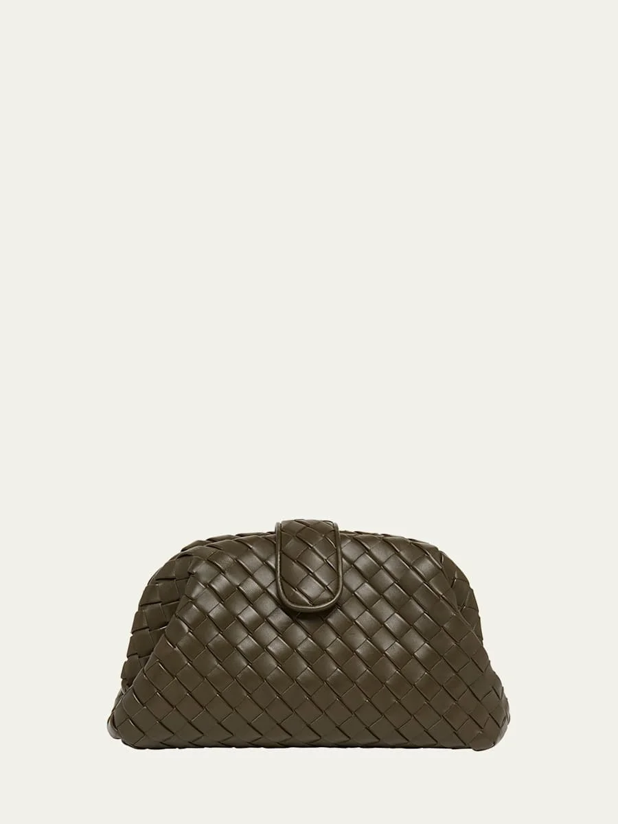 Bottega Veneta "Lauren 1980 Teen" clutch bag in intrecciato leather Woven chain shoulder strap Can be worn as a clutch or shoulder bag Structured top with center magnetic strap Interior, one zip pocket Approx. 6.5"H x 12.4"W x 4.3"D Made in Italy