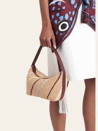 Bottega Veneta "Wallace" shoulder bag crafted from woven fabric and featuring a striking striped pattern Adjustable shoulder strap Zip top closure Approx. 5.1"H x 7.8"W x 3.7"D Nylon/cotton/leather Made in Italy Online Inquiries: BGS21_V6GV5| Store Inquiries: #4987039