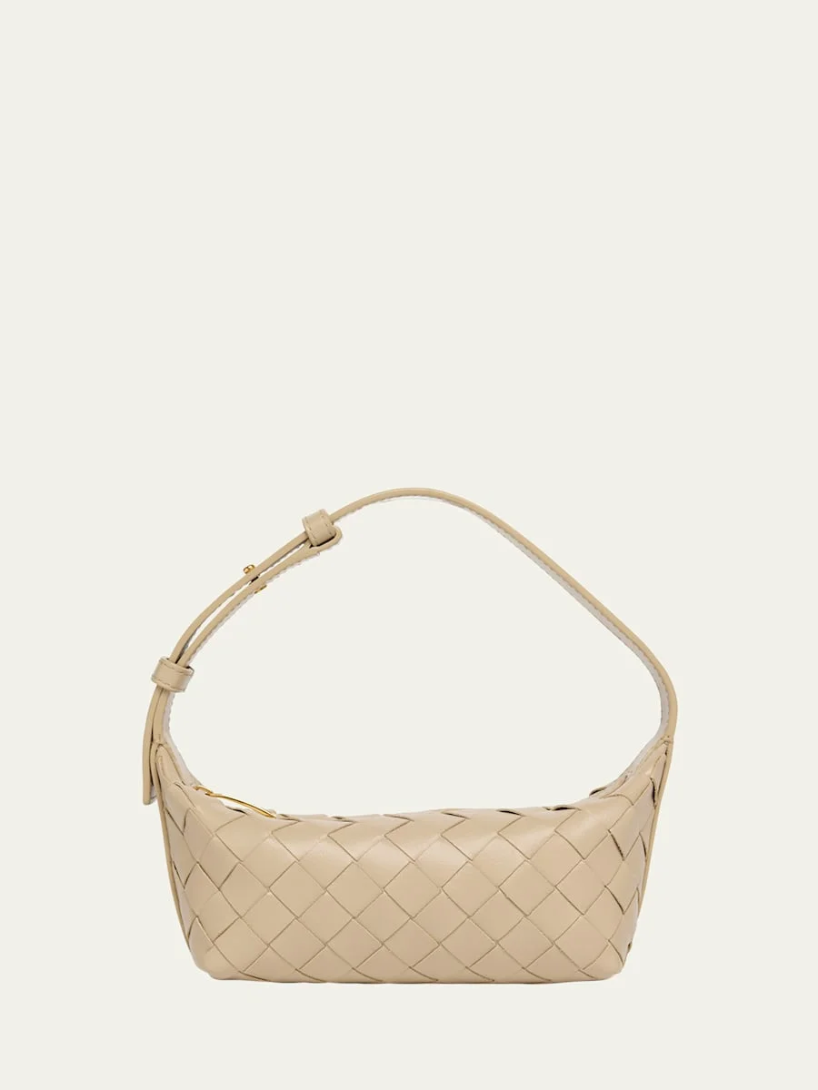 Bottega Veneta "Wallace Town" leather pouch shoulder bag with signature intrecciato design Adjustable shoulder strap Zip top closure Interior, one card slot Approx. 3.9"H x 6.2"W x 2.7"D Made in Italy