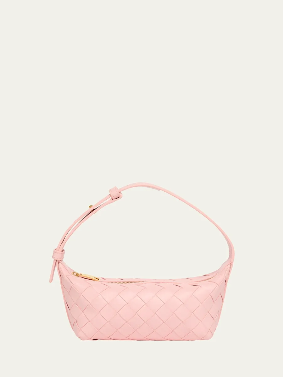 Bottega Veneta "Wallace Town" leather pouch shoulder bag with signature intrecciato design Adjustable shoulder strap Zip top closure Interior, one card slot Approx. 3.9"H x 6.2"W x 2.7"D Made in Italy