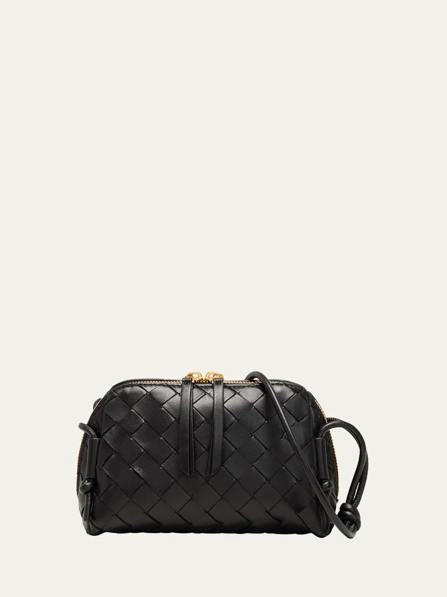 Bottega Veneta concert pouch shoulder bag in intrecciato leather Shoulder strap Twoway zip top closure Interior, one slip pocket Approx. 4.5"H x 7.3"W x 3.3"D Made in Italy
