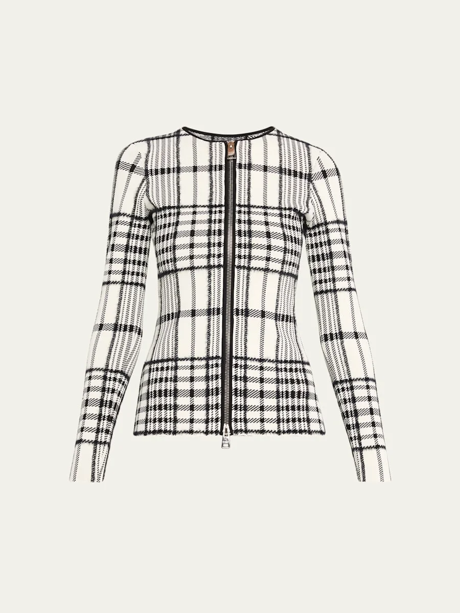 The Greer Zip Front Knit Cardigan in Ivory Plaid