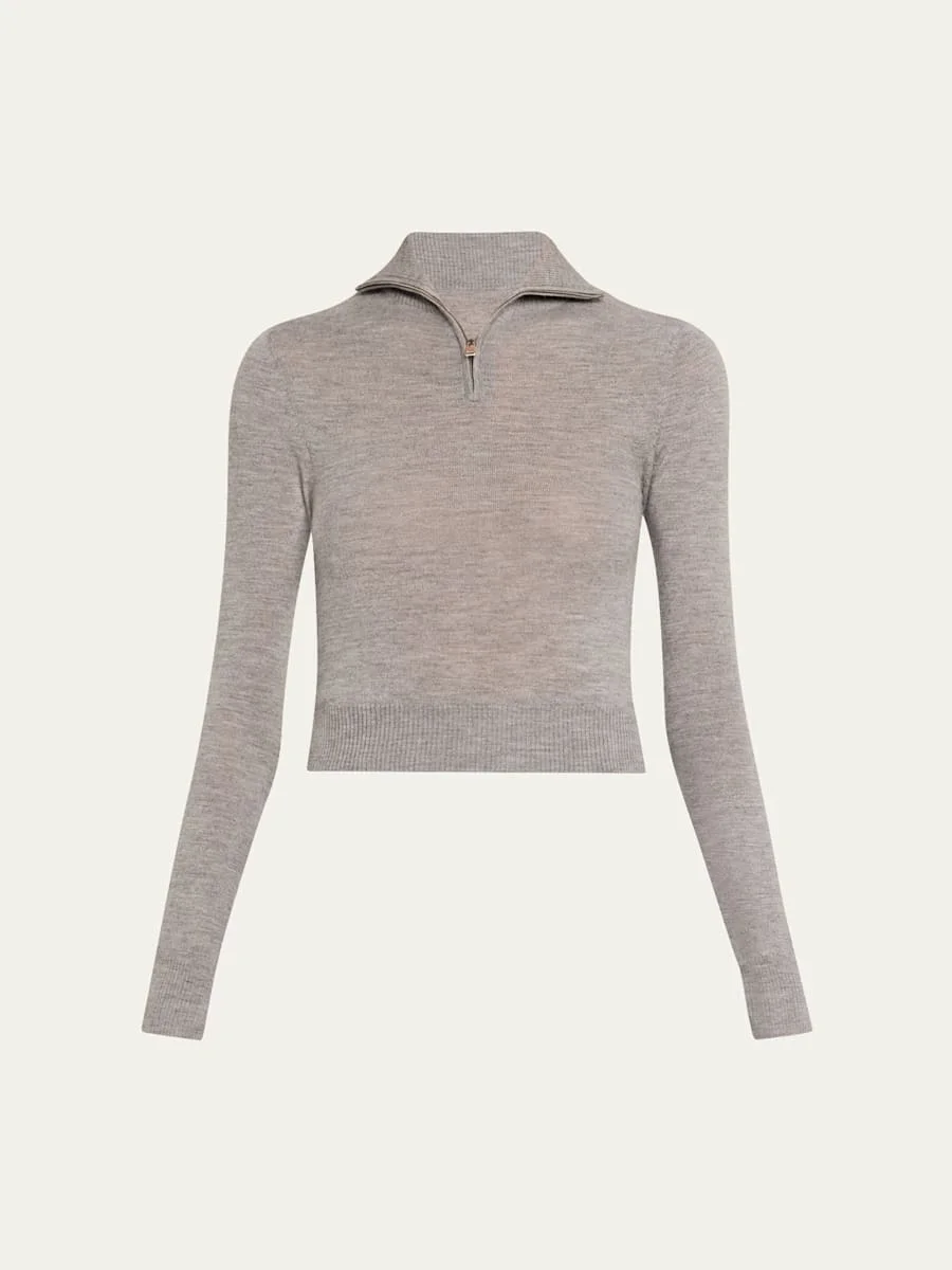 This Brandon Maxwell "The Paxton" fine rib sweater is knit in a heathered blend of cashmere and recycled cashmere Stand collar with a half zip Long sleeves Slim fit Pullover style Cashmere Dry clean Imported Online Inquiries: BGS21_BAAQQ| Store Inquiries: #5068089