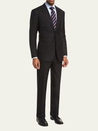 Brioni "Essential" two-piece suit. Notch lapel; two-button front. Lightly padded natural shoulder. Basted sleeves. Welt pocket at chest. Flap pockets at hips. Double-vented back. Includes matching flat-front trousers with straight leg. Unfinished hem to be tailored to desired length. Virgin wool; rayon lining; dry clean. Handmade in Italy. Model is 6'1"/185cm. Online Inquiries: BGS21_M313V| Store Inquiries: #1685796