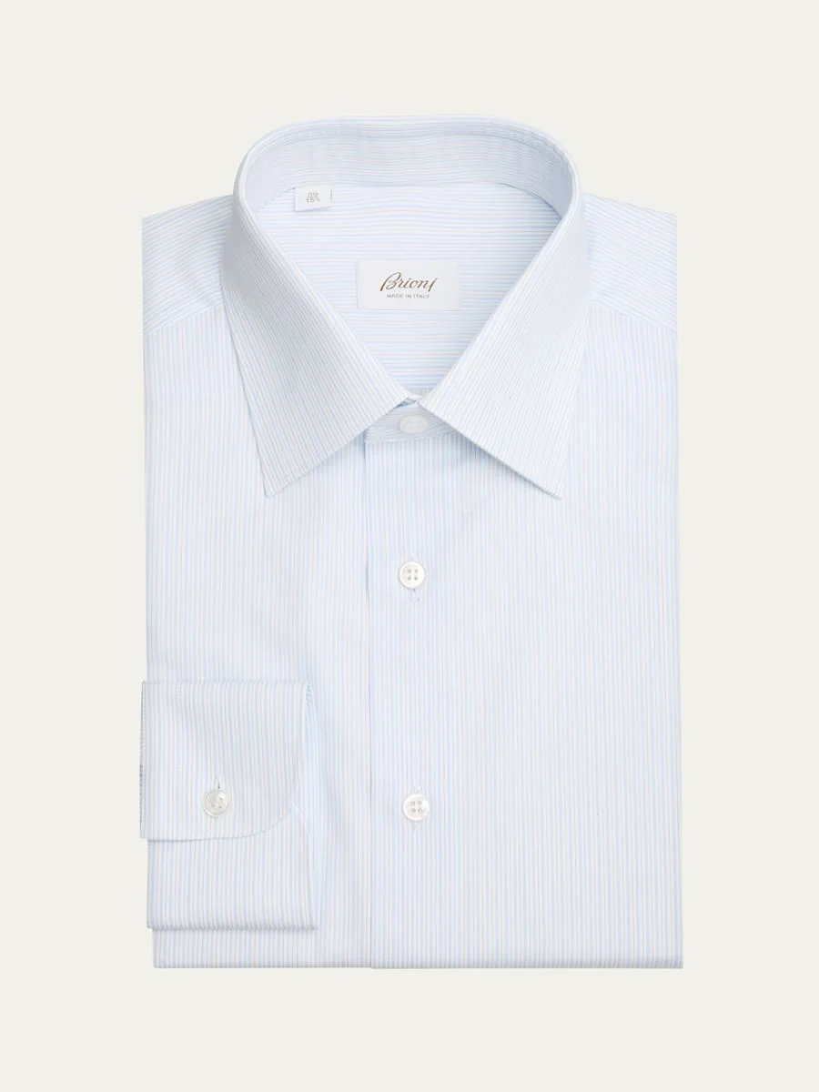 Brioni dress shirt in cotton featuring a multi-stripe print Point collar Button placket Long sleeves Round barrel cuffs Shirttail hem Cotton Made in Italy Online Inquiries: BGS21_NCSVX| Store Inquiries: #4944445