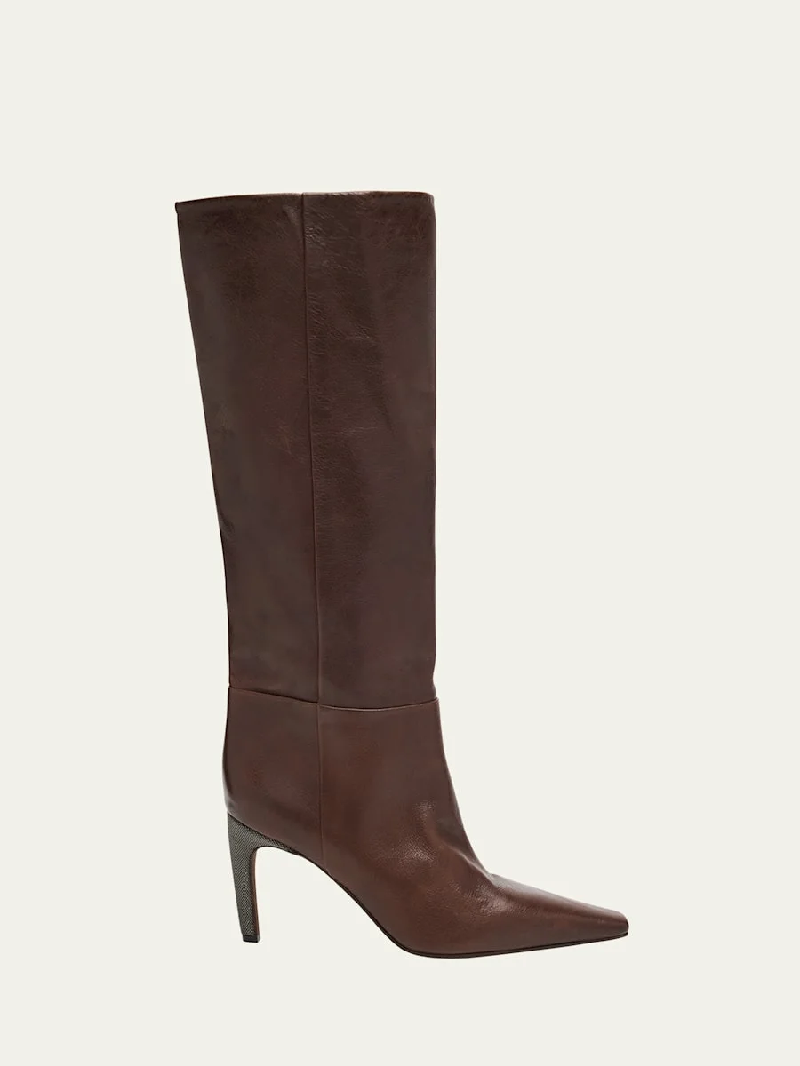 Finished with signature monili detailing at the heel, these kneehigh boots by Brunello Cucinelli are crafted from smooth leather 3.15 / 80 mm stiletto heel Pointed toe Structured shaft Pullon style Made in Italy