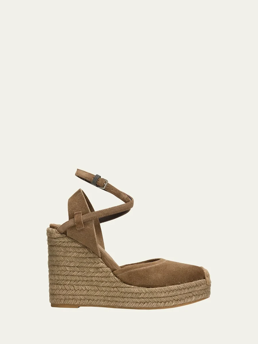 These espadrille platform sandals by Brunello Cucinelli are designed with a supple suede upper and monili trim adorning the strap 3.15 in / 80 mm braided jute wedge heel Round toe Adjustable ankle strap Suede insole Rubber outsole Made in Italy