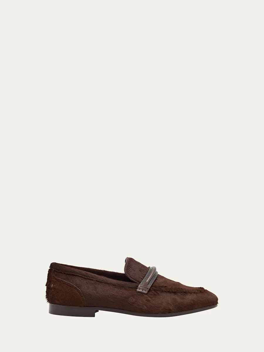 Brunello Cucinelli dyed calf hair (Italy) loafers Flat heel Almond moc toe Notched vamp with monili bar strap Slip-on style Leather outsole Lining: Leather/cotton Professional cleaning recommended, spot clean Made in Italy Online Inquiries: BGS21_X6XM9| Store Inquiries: #5040437