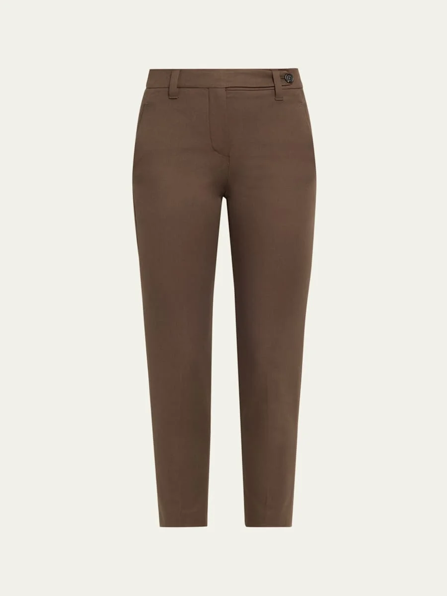 Brunello Cucinelli cotton twill pants featuring a monili belt loop detail Mid rise sits high on hip Flat front Side slip pockets; back welt pockets Slim legs Cropped at the ankle BUttontab/zip fly; belt loops Cotton/elastane Lining: Polyester/acetate/cupro Made in Italy