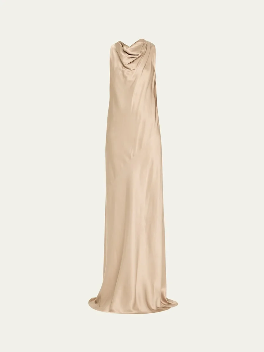 Brunello Cucinelli gown drapes elegantly in silk satin, with a fluid bias cut that skims the figure, finished with a cowl neckline that frames the decollete Cowl neckline Sleeveless Aline silhouette Floor sweeping hem Back zip Silk Lining: Silk/acetate Dry clean Made in Italy