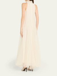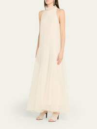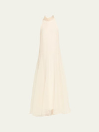 Brunello Cucinelli dress is crafted from crispy silk chiffon accented with a dropped waist and a paneled flowy skirt Mock neckline Sleeveless Drop waist Aline silhouette Floor length Back zip Silk Lining: Acetate/silk Made in Italy