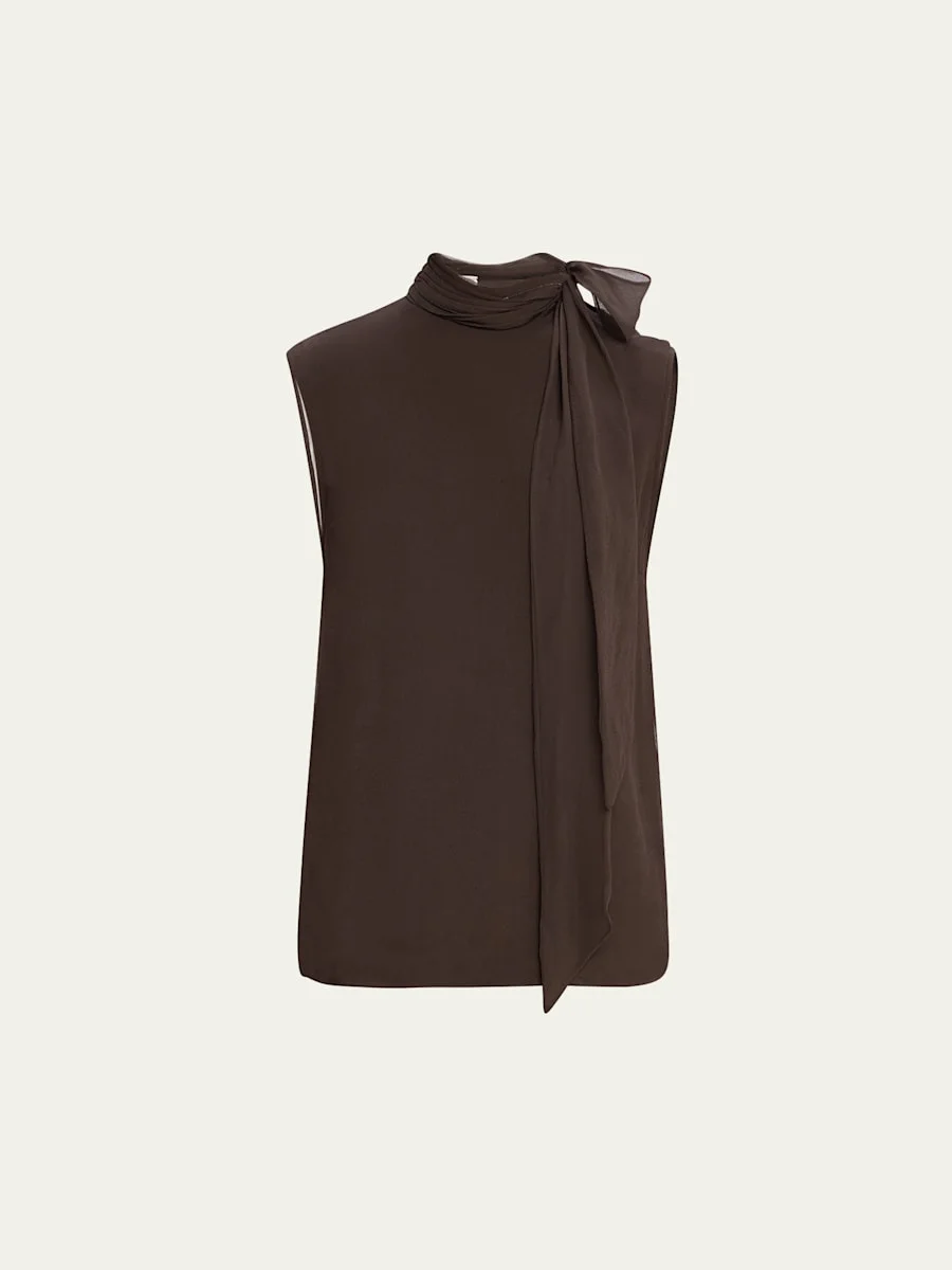 Brunello Cucinelli silk chiffon blouse accentuated with a self-tie collar Sleeveless Classic fit Hem falls to the hip Pullover style Silk Lining: Silk/acetate Dry clean Made in Italy Online Inquiries: BGS21_BA4G3| Store Inquiries: #5033322