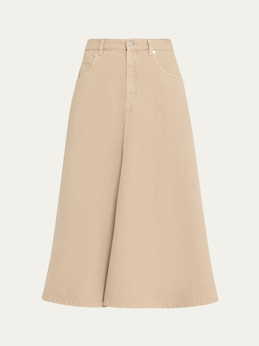 Brunello Cucinelli skirt is crafted of a garment dyed cottonlinen blend featuring a signature monili belt loop on the back and a leather logo patch on the back Mid waist Fivepocket style Fitandflare silhouette Hem falls below the knee Button/zip fly; belt loops Cotton/linen/leather Lining: Cotton Made in Italy