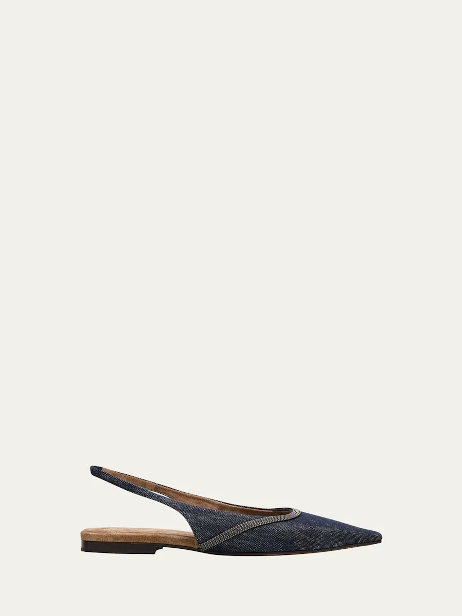 Brunello Cucinelli denim ballerina flats with signature monili beading detail Snipped, pointed toe Stretch slingback strap Leather outsole Lining: Leather Professional cleaning recommended, spot clean Made in Italy Online Inquiries: BGS21_X6UU5| Store Inquiries: #4981362