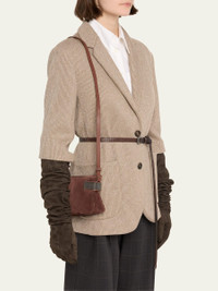 Brunello Cucinelli "Essence" mini shoulder bag in calfskin suede with monili trim Detachable, adjustable shoulder strap Double zip top closure Interior, one card slot Lining: Leather Approx. 5.3"H x 8.7"W x 2.8"D Made in Italy