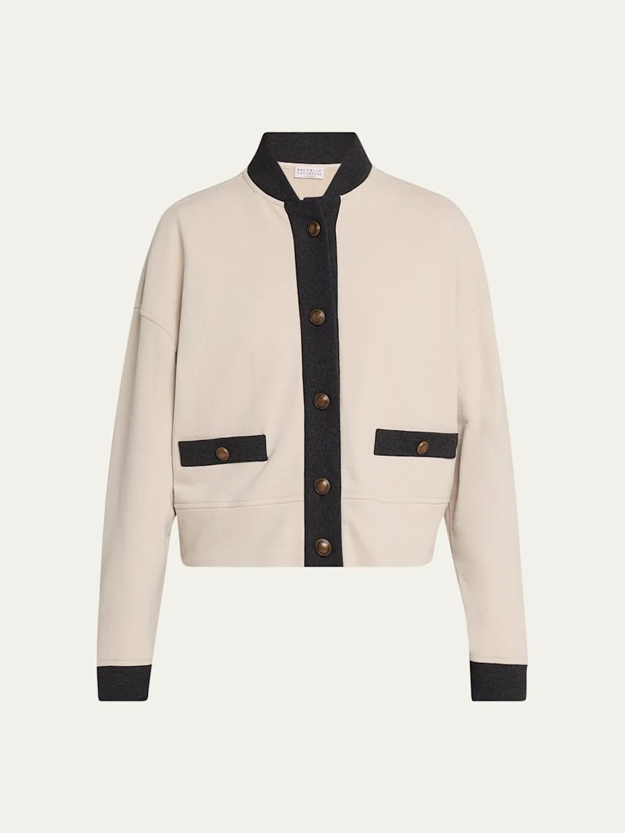 Brunello Cucinelli felpa bomber cardigan featuring contrast ribbed trim Baseball collar; button front Long sleeves; ribbed cuffs Hipe snapwelt pockets Relaxed fit Hip length Banded hem Cotton Made in Italy