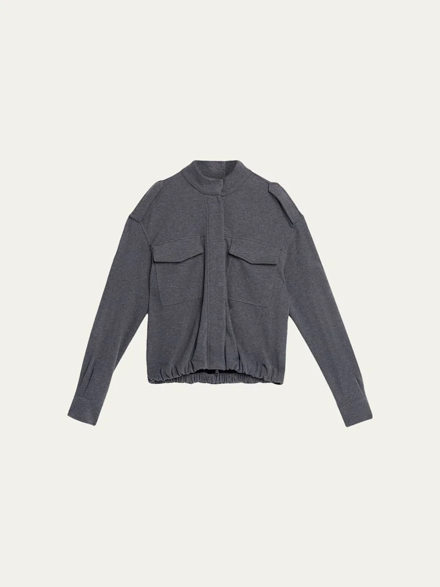 An elevated take on everyday layering, this Brunello Cucinelli jacket is crafted from soft felpa jersey and features tailored safariinspired detailing. Stand collar; singlebreasted front Long sleeves; snap cuffs Shoudler epaulets Chest flap pockets Loose fit Gathered bubble hem Cotton/acetate/silk Made in Italy