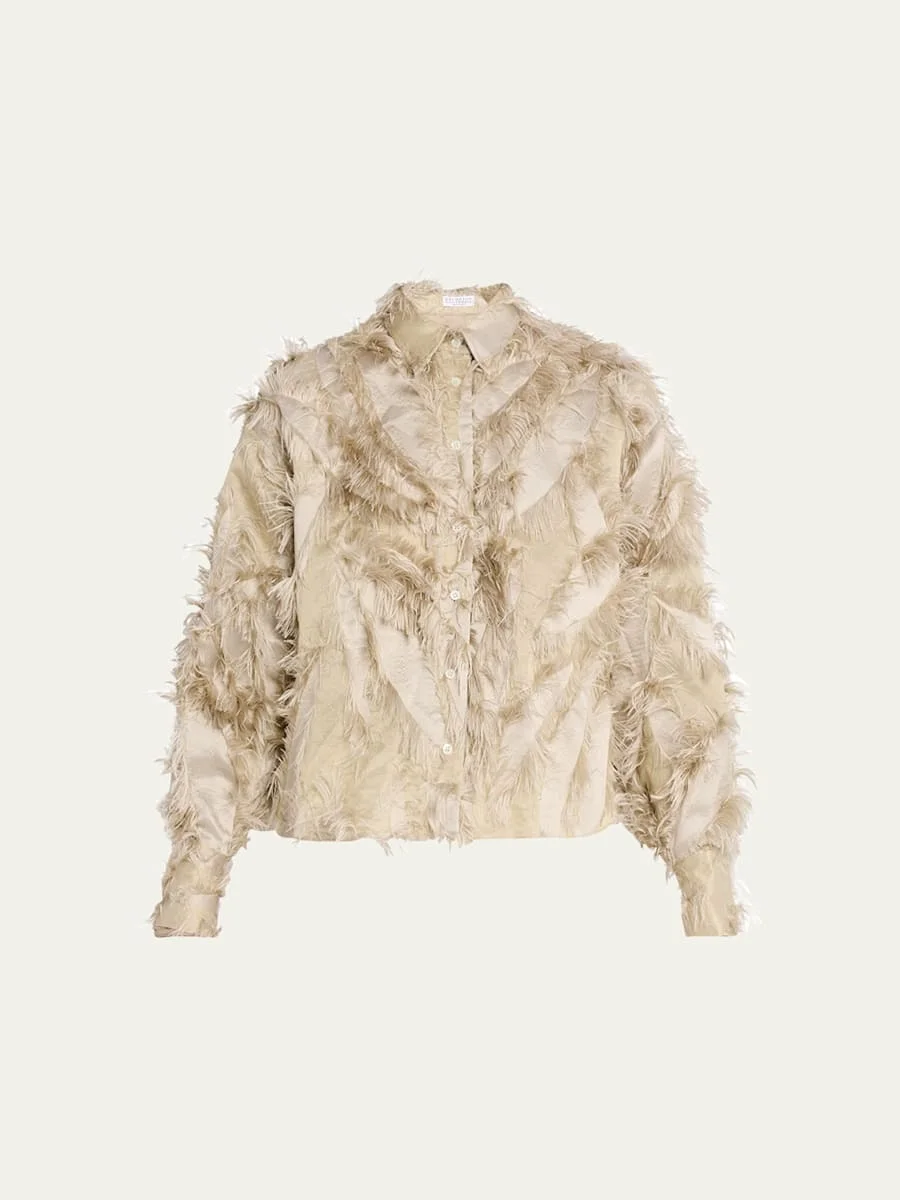 Brunello Cucinelli bomber jacket in fringed fil coupe jacquard Point collar; button front Long sleeves; button cuffs Loose fit Hip length Acetate/polyester/cotton Lining: Silk/acetate Made in Italy
