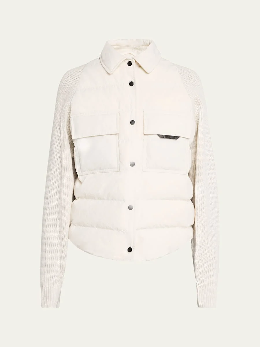 Brunello Cucinelli padded jacket in quilted crinkle cotton techno and knit sleeves with a monili trimmed pocket Point collar; snap front Long raglan sleeves; ribbed cuffs Chest flap pockets Straight fit Hip length Nylon/polyamide/cotton Fill: polyester Made in Italy