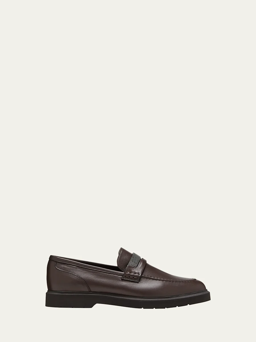 Brunello Cucinelli soft leather penny loafers with beaded monili trim Flat heel Round apron toe Notched vamp with embellished keeper strap Slipon style Leather lining Leather outsole Made in Italy