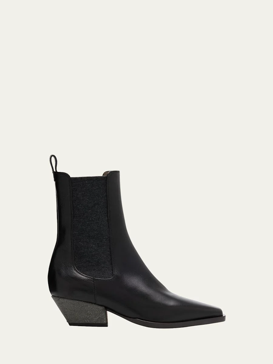 Brunello Cucinelli sleek leather western Chelsea booties with virgin wool trim and beaded monili detailing 1.75 in / 45 mm embellished block heel Snipped, pointed toe Pull-on style Rubber outsole Lining: Leather Made in Italy Online Inquiries: BGS21_X6UUF| Store Inquiries: #4981386