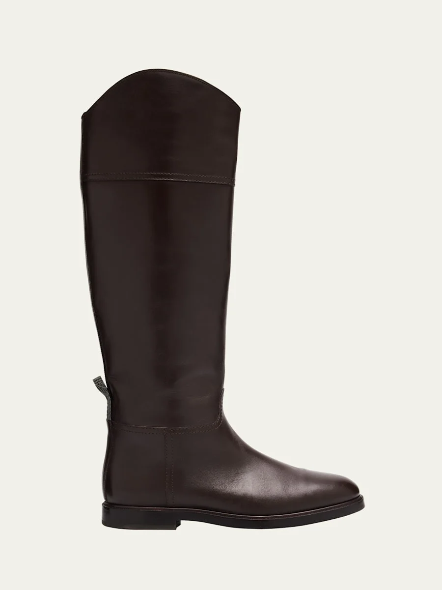 Brunello Cucinelli "Mat" equestrian riding boots in calfskin leather 0.50 in / 15 mm flat heel Almond toe Side zip eases dress Leather outsole Lining: Leather/cotton Professional cleaning recommended, spot clean Made in Italy Online Inquiries: BGS21_X6XMA| Store Inquiries: #5040439