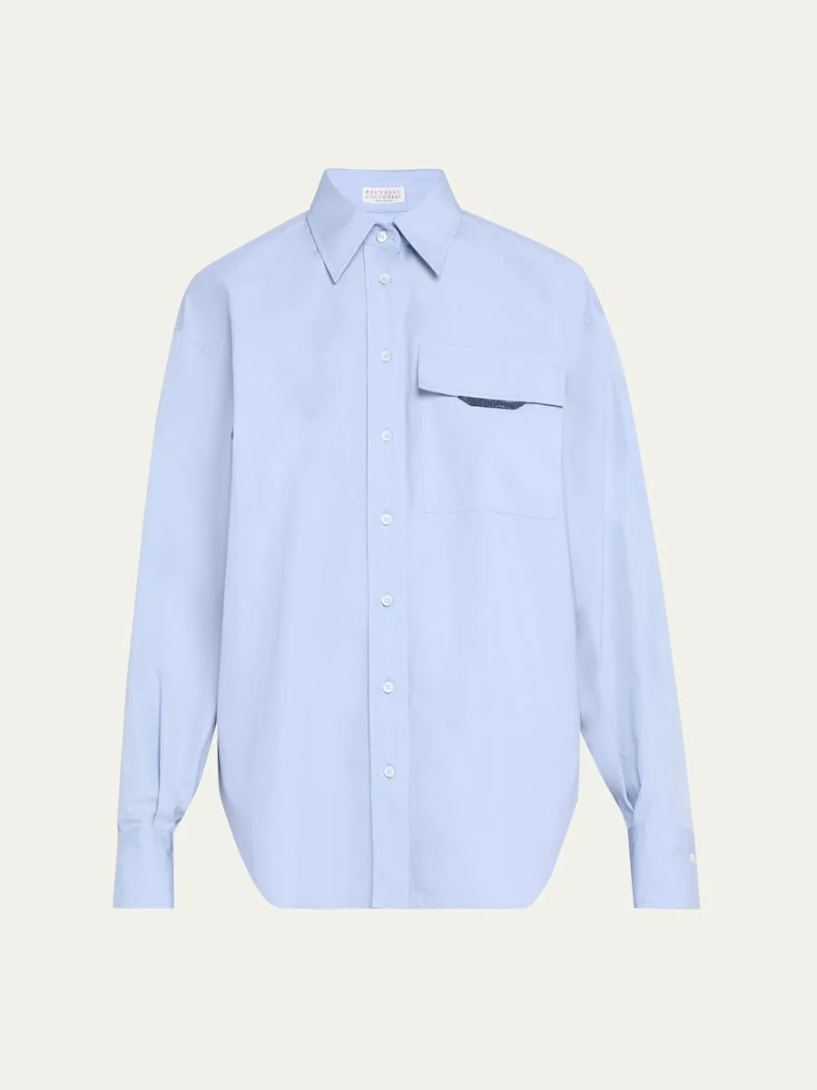 Brunello Cucinelli poplin shirt with signature monili trim Collar neckline Button front Front chest pocket Long sleeves; button cuffs Shirttail hem Cotton Made in Italy