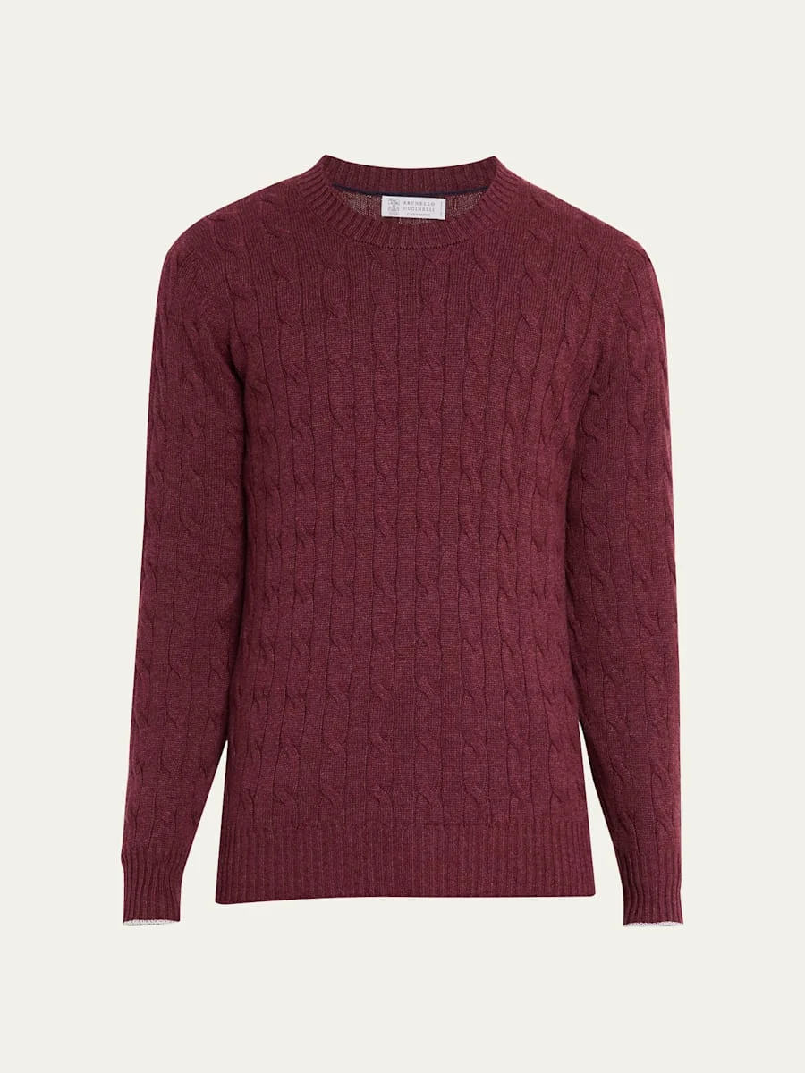 Brunello Cucinelli sweater in cashmere for an ultrasoft handfeel, revealed in a classic cable knit design Crew neckline Long sleeves Ribbed cuffs and hem Pullover style Cashmere Unlined Dry clean Made in Italy