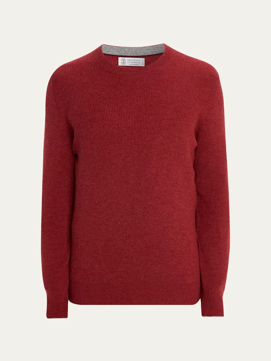 Brunello Cucinelli solid sweater in English rib cashmere revealing a soft and sumptuous handfeel Crew neckline Long sleeves Ribbed cuffs and hem Classic fit Pullover style Cashmere Made in Italy Online Inquiries: BGS21_NDL5L| Store Inquiries: #5042712