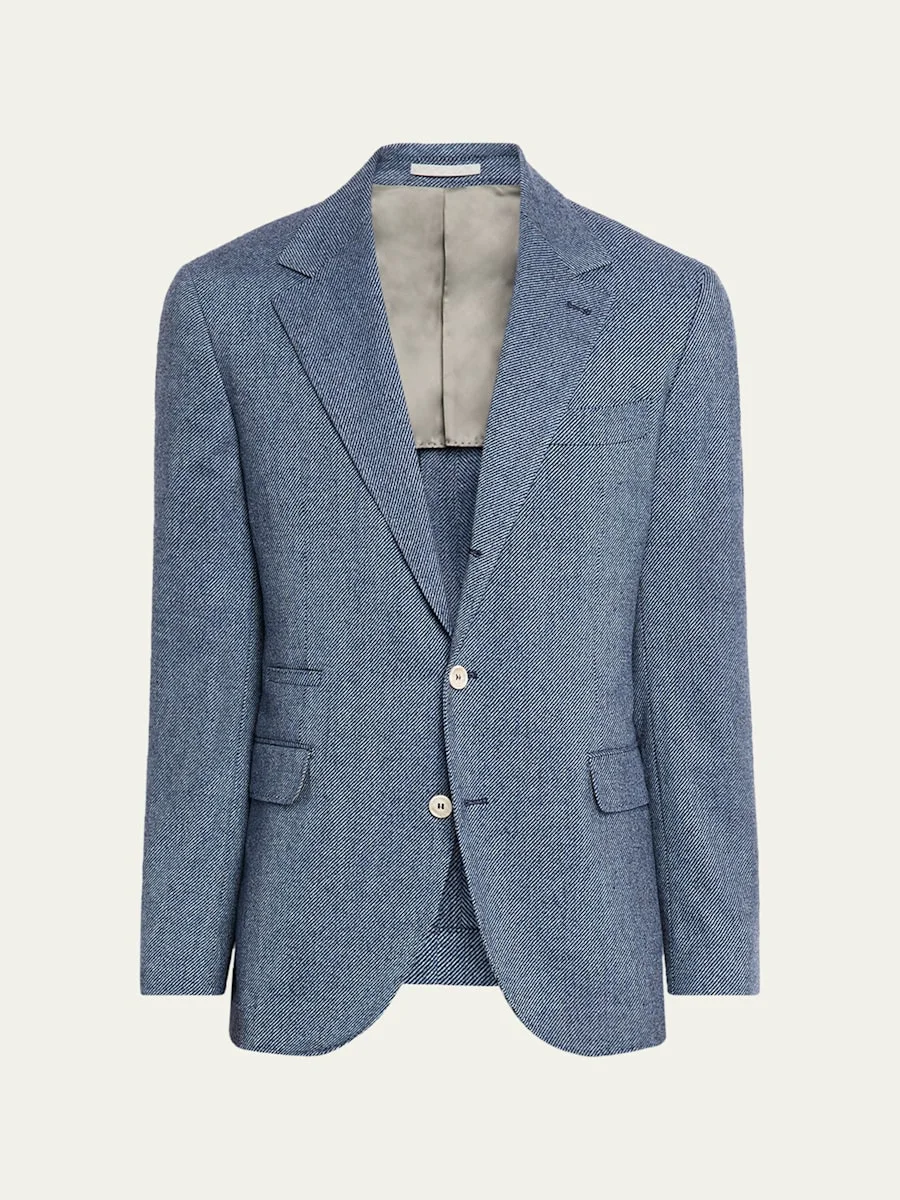 Brunello Cucinelli sport jacket in microstripe twill for traditional styling Notched lapels Barchetta pocket Hip flap pockets Ticket pocket Long sleeves Internal breast pocket Doublevented back Wool/cashmere/silk Dry clean Made in Italy