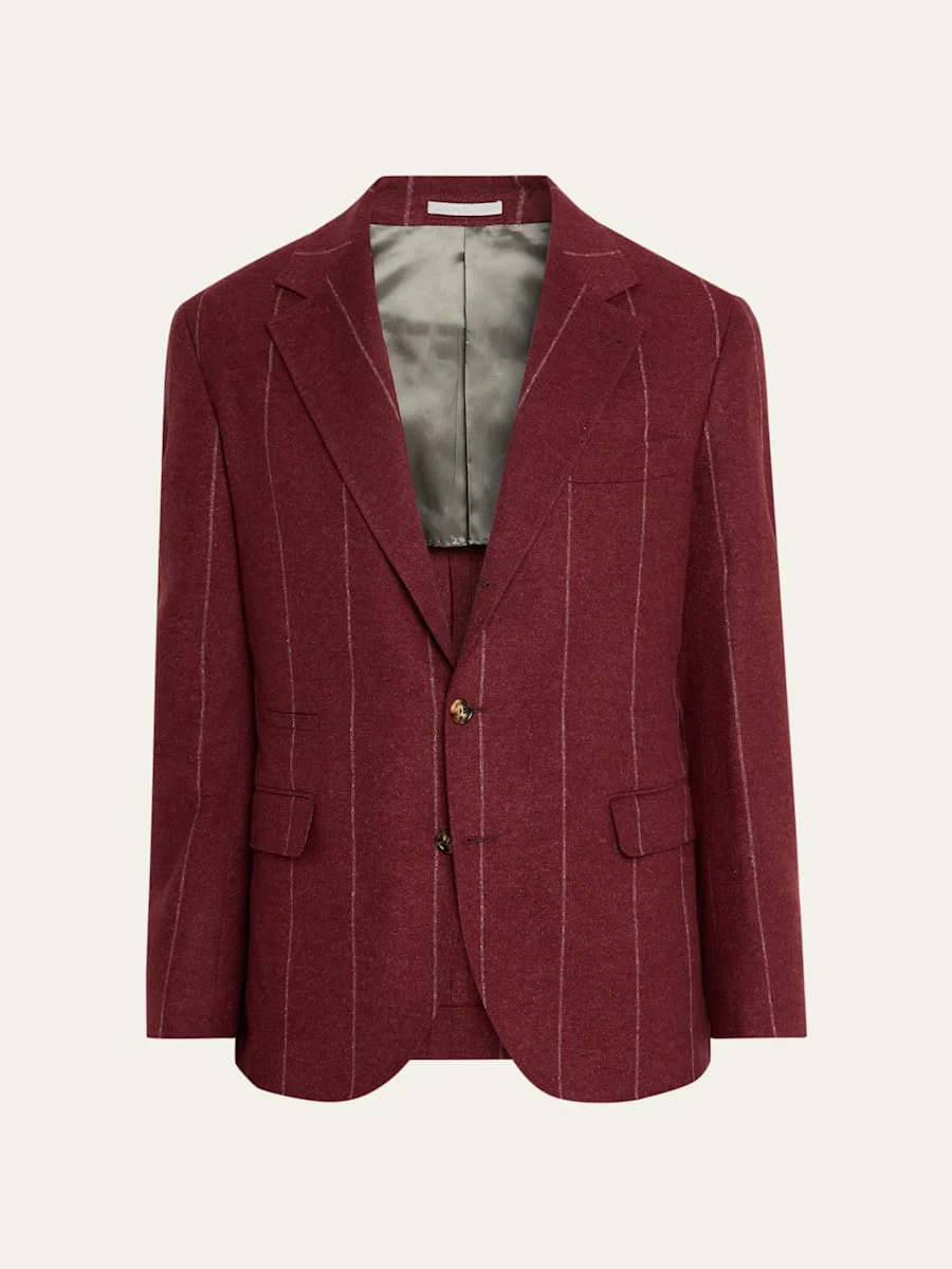 Brunello Cucinelli chalk stripe flannel blazer finished with four horn buttons on the cuffs Notched lapels Long sleeves Two interior pockets with button closure Welt flap pockets Double back vent Mid-length Classic fit Single-breasted button closure Silk/wool/cashmere Lining: Cupro Dry clean Made in Italy Online Inquiries: BGS21_NDGK1| Store Inquiries: #5039542